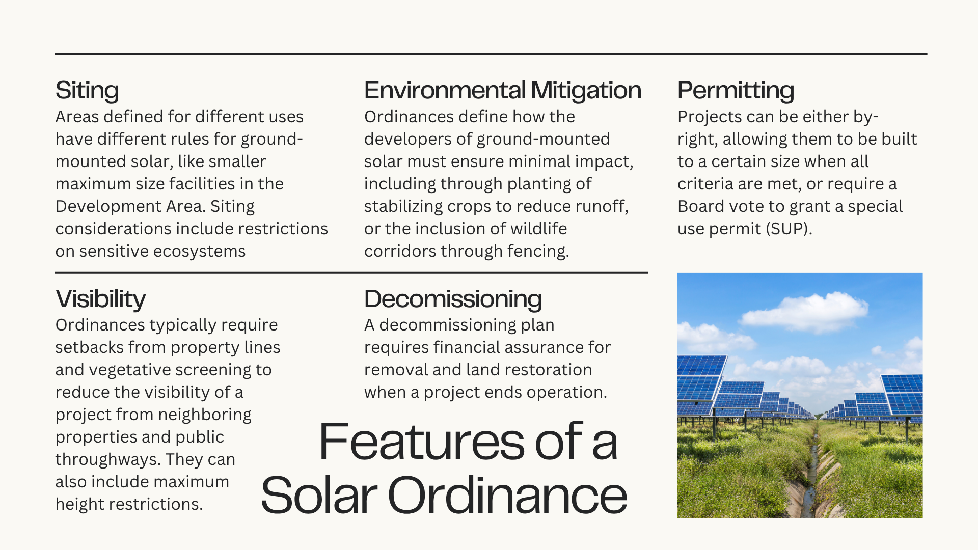Allowing by-right solar facilities up to 21 acres of fenced area streamlines smaller, community-scale projects that don’t require transmission lines. By-right solar provisions are not a given in the Commonwealth, and including them in the County’s ordinance opens up new economic opportunities.