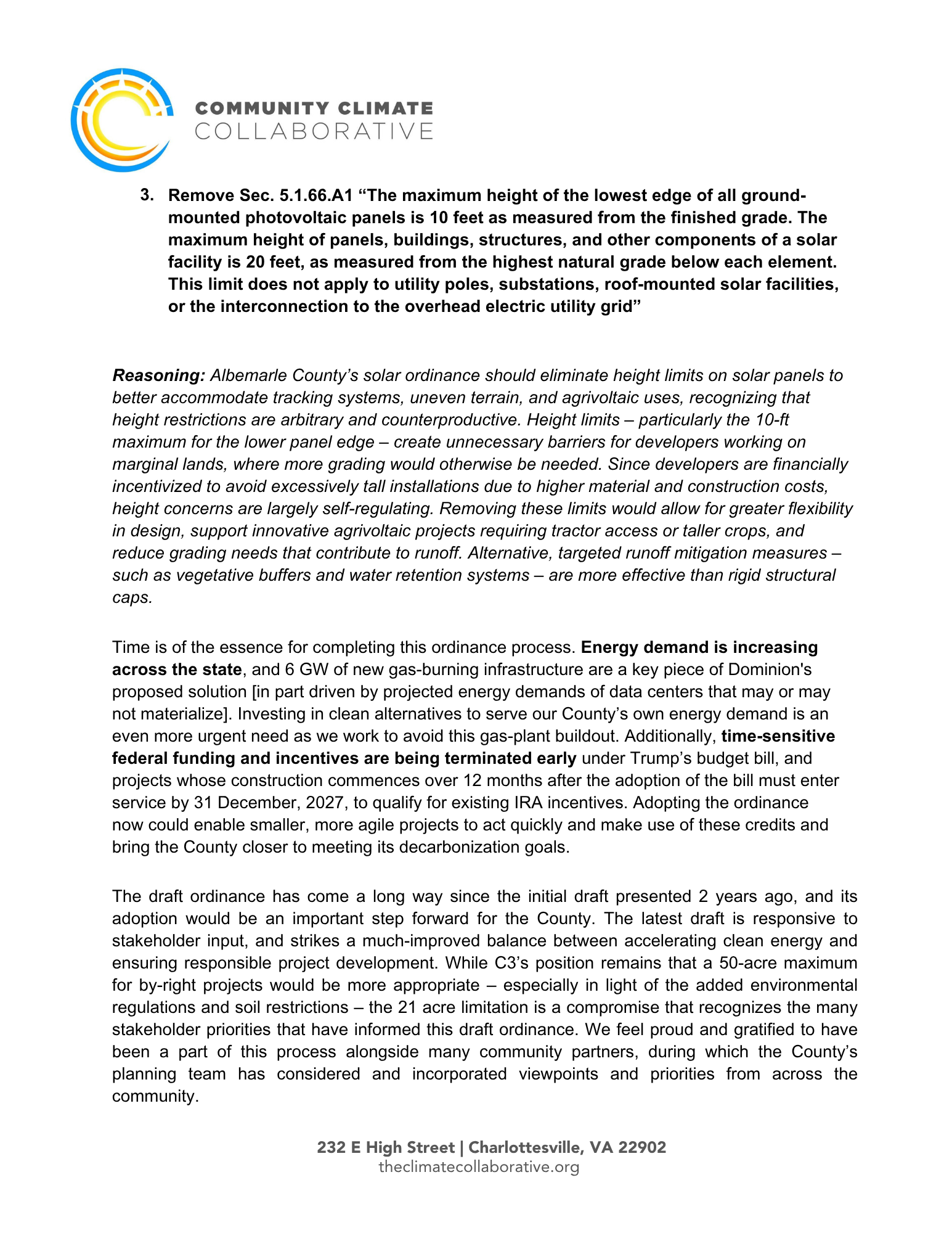 Email bos@albemarle.org with the subject line “Please pass the solar ordinance on July 17” - let the Board of Supervisors know you want them to urgently pass this solar ordinance now, so that we can start to see the benefits of streamlining the ordinance sooner.