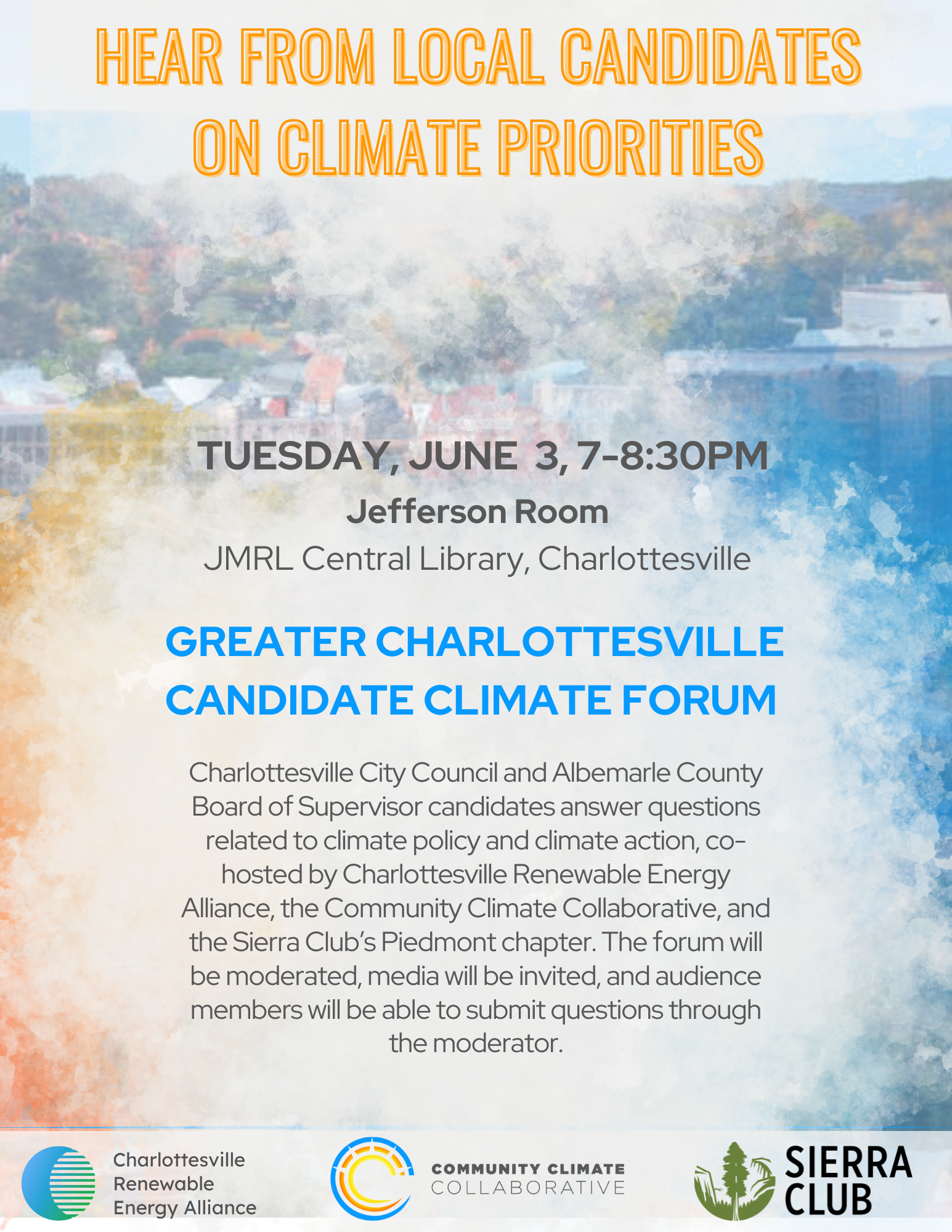 Charlottesville City Council and Albemarle County Board of Supervisor candidates answer questions related to climate policy and climate action, co-hosted by Charlottesville Renewable Energy Alliance, the Community Climate Collaborative, and the Sierra Club’s Piedmont chapter. The forum will be moderated, media will be invited, and audience members will be able to submit questions through the moderator.